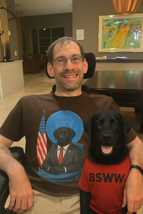 Welcome to BS Wetwear — a brand born out of humor, hustle, and a whole lot of heart. I’m Brent, and that legend sitting next to me is Tonka, my best friend and forever mascot.