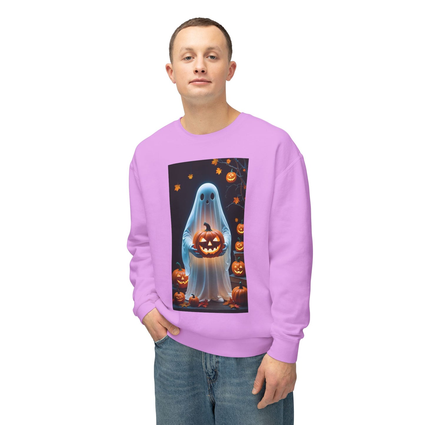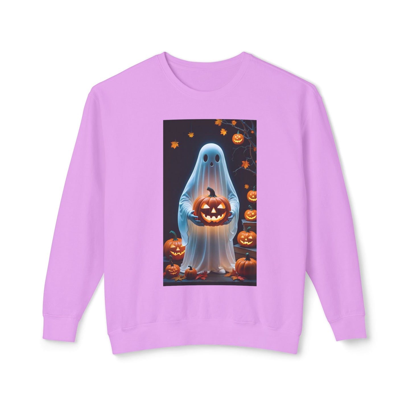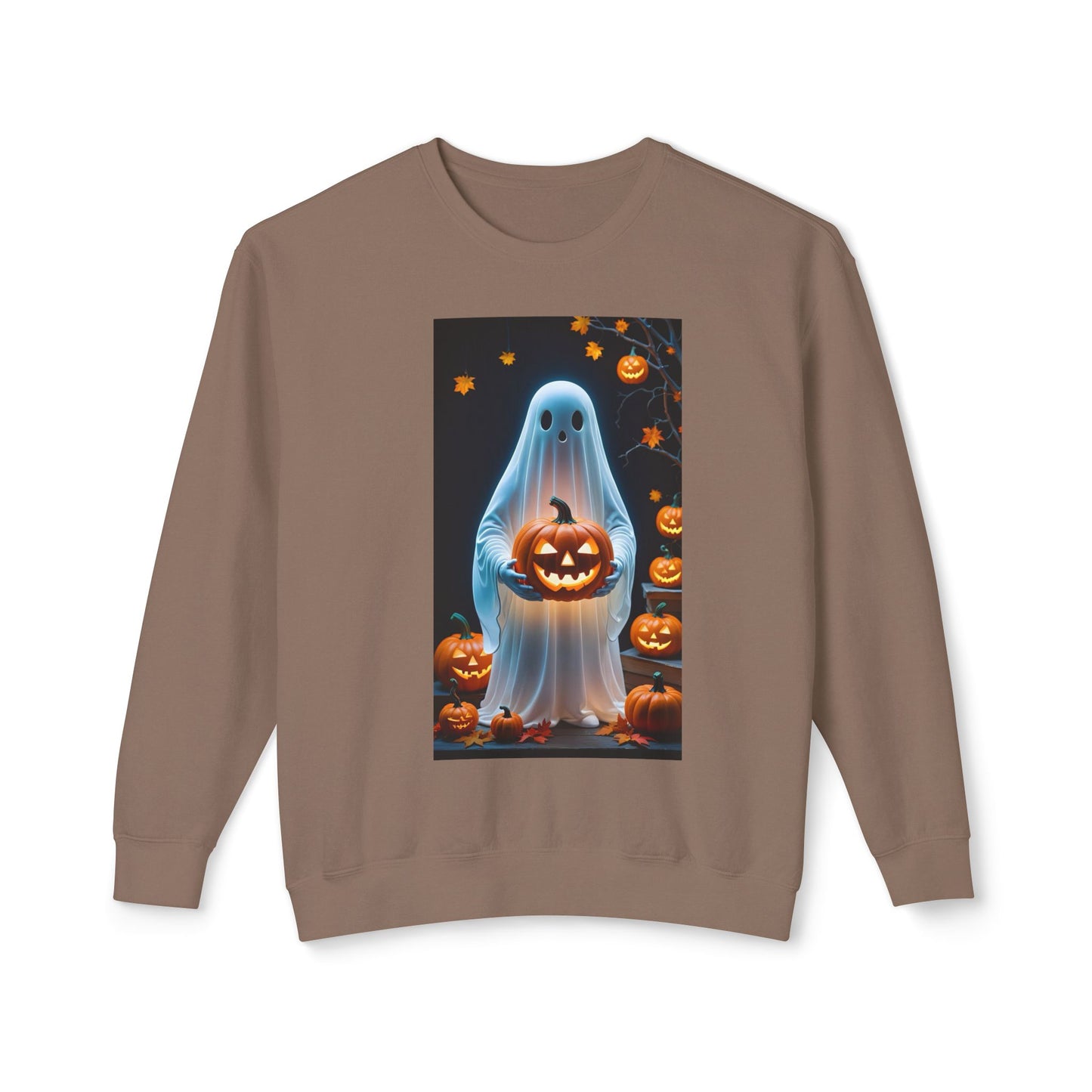 Picture a ghost that clearly gave up on scaring people and is now moonlighting as a pumpkin handler. Its face says 'boo,' but the jack-o’-lantern it's holding looks way more into the Halloween spirit. Pumpkins everywhere are just hanging out like they're part of some gourd family reunion, all grinning like they know something you don’t. Toss in some fall leaves, and it’s more of a 'spooky but make it fashion' situation. Basically, it’s the most laid-back haunting you’ll ever see, perfect for BS Wetwear's quirky vibes!