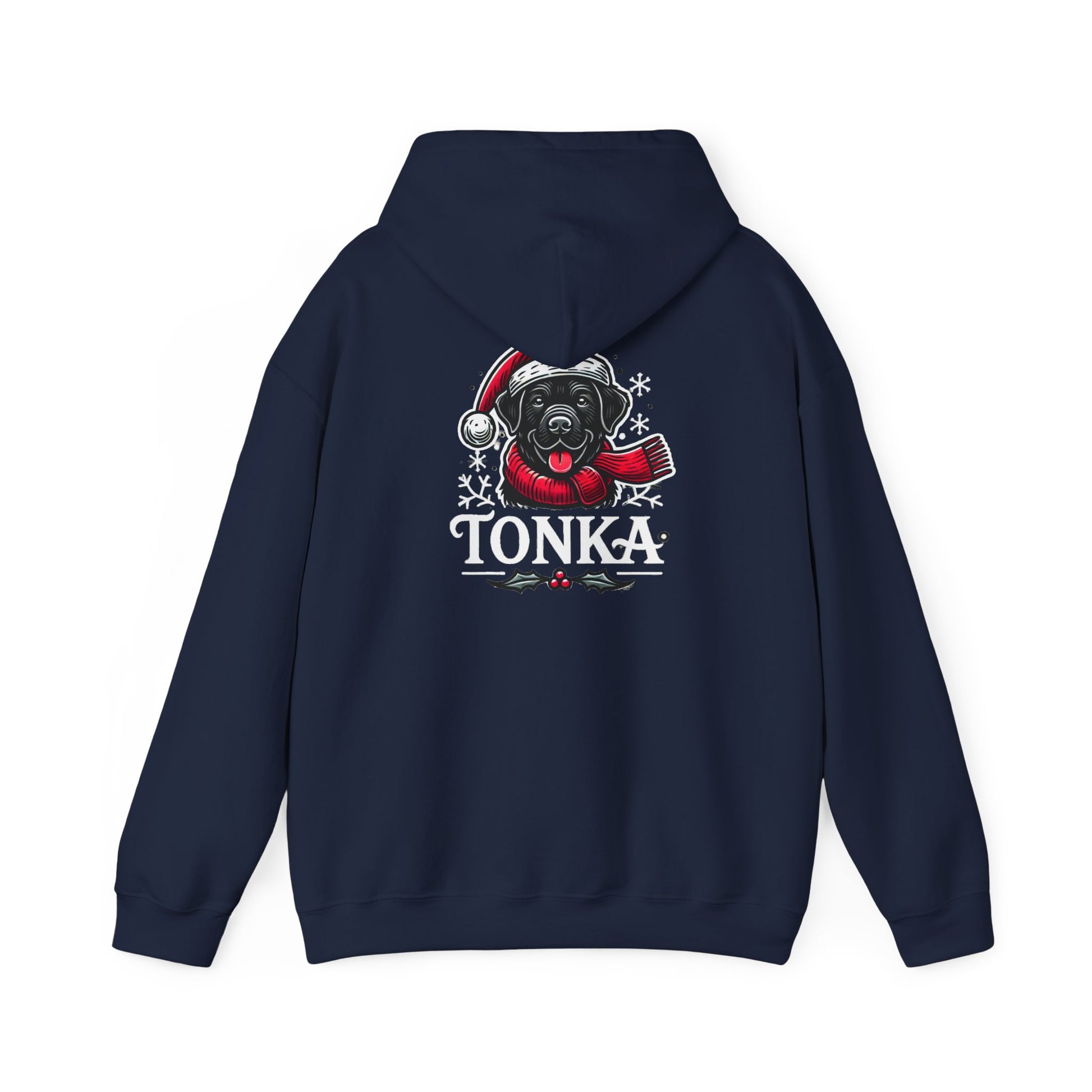 On the back, Tonka is decked out in his Christmas best! He’s proudly wearing a red Santa hat and a matching red scarf, bringing both warmth and festive vibes. Tonka’s playful, happy expression shines through, making him the star of the holiday season. The simple but bold design lets Tonka’s joyful holiday spirit speak for itself.