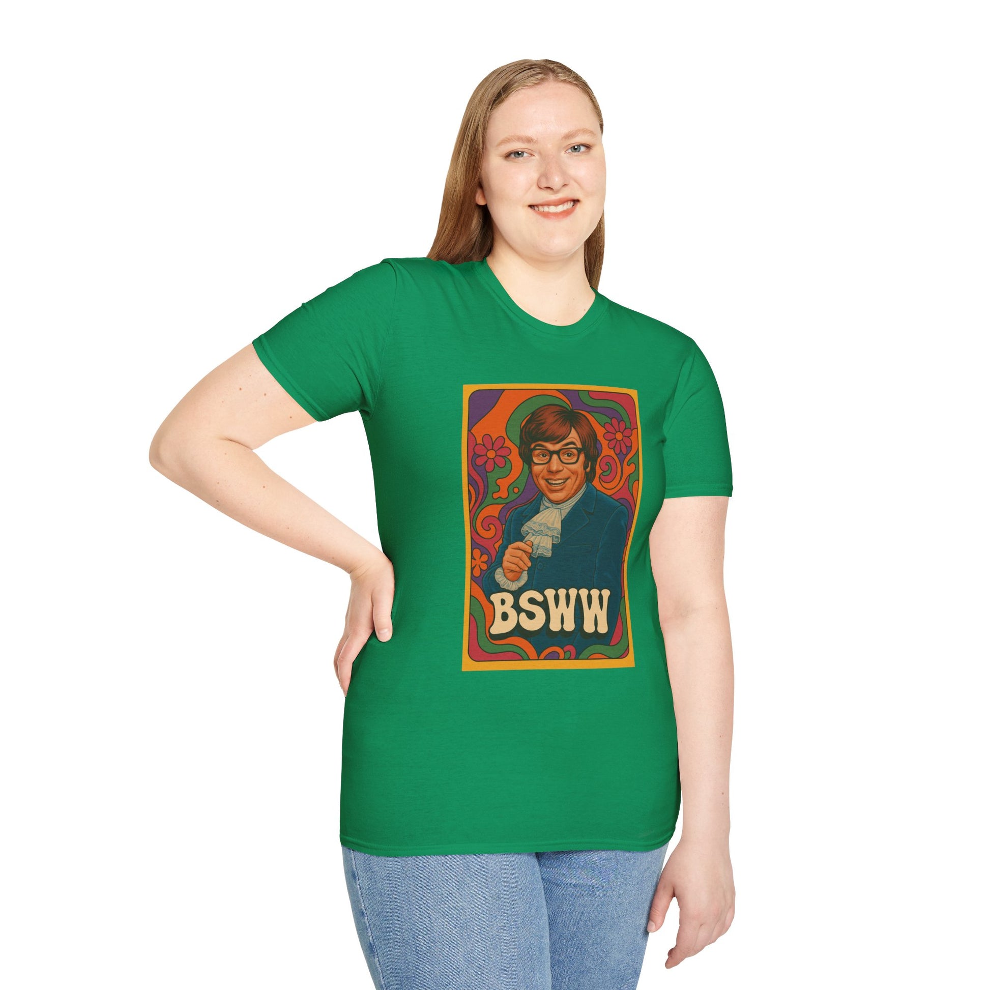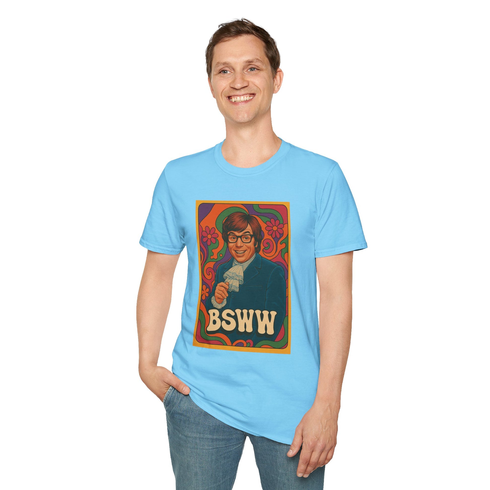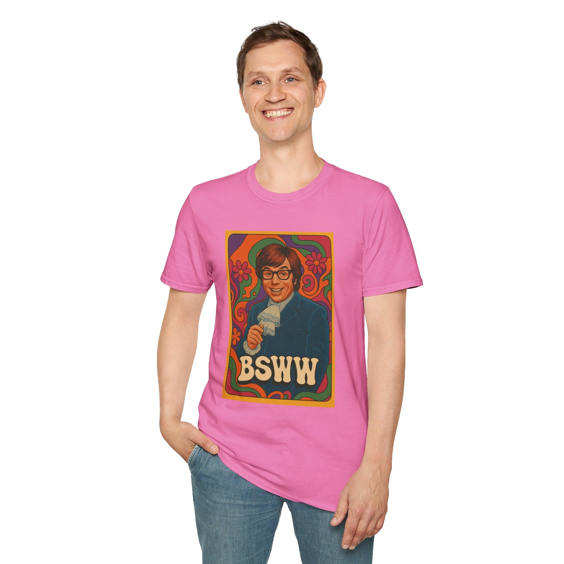 This image is what happens when 1969 ate a magic mushroom and joined the BSWW crew. We’ve got swirls, flowers, and one velvet-clad legend cheesin’ like he just discovered waterproof bell-bottoms. His smile says “moist and dangerous,” and the frilly cravat screams “I model for puddles, baby.” The background looks like a lava lamp and a fruit roll-up had a messy, psychedelic love child. And then — BOOM — BSWW lands front and center like a funky slap from the fashion gods. This isn’t just a design, it’s a certified time-traveling drip explosion.