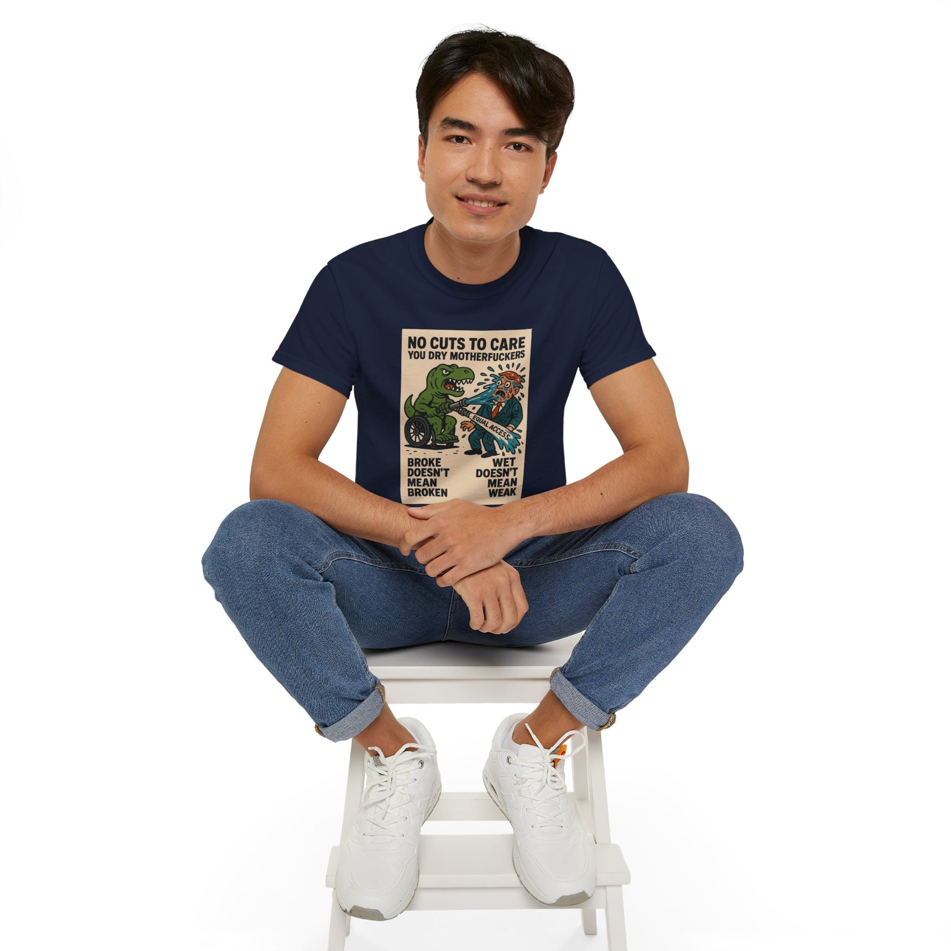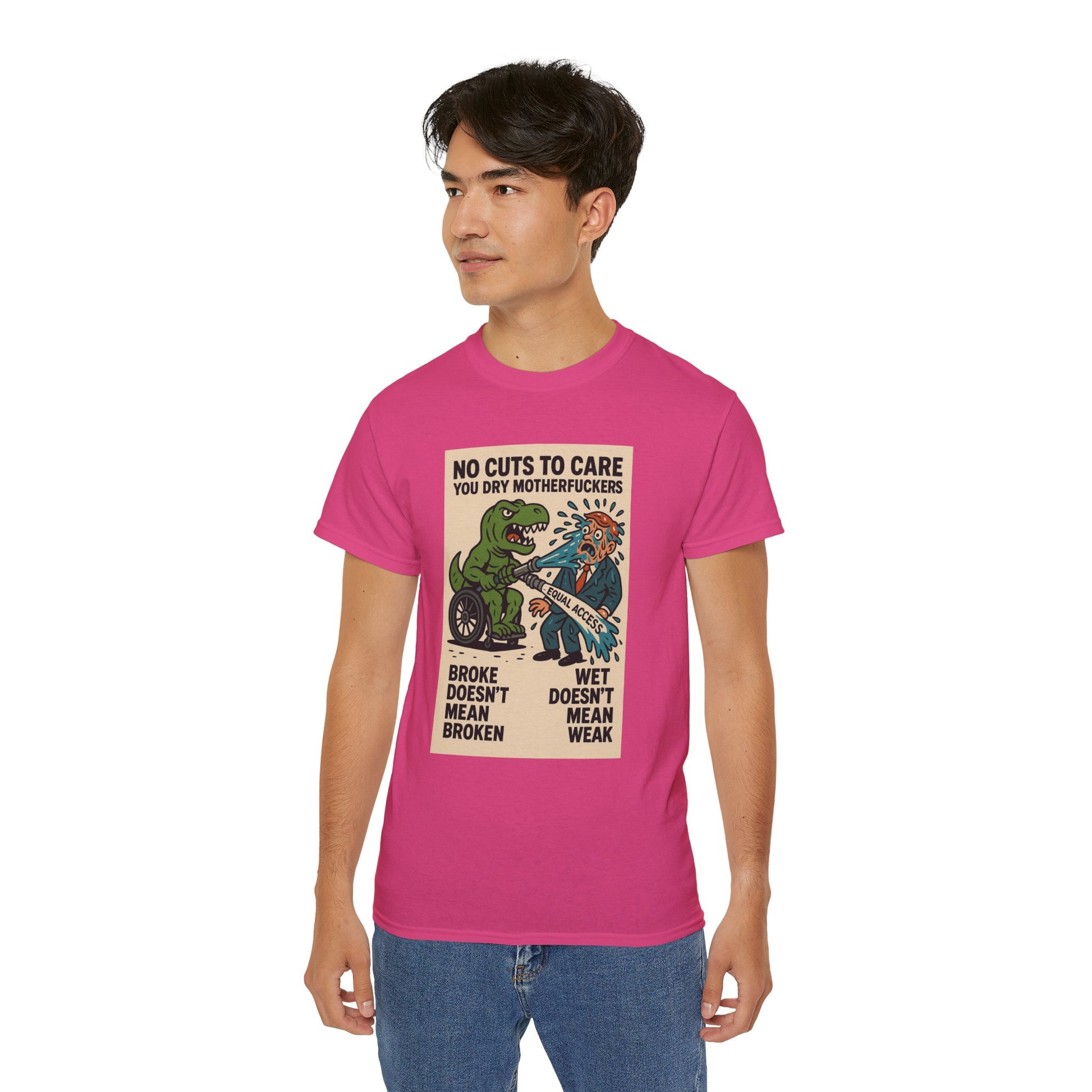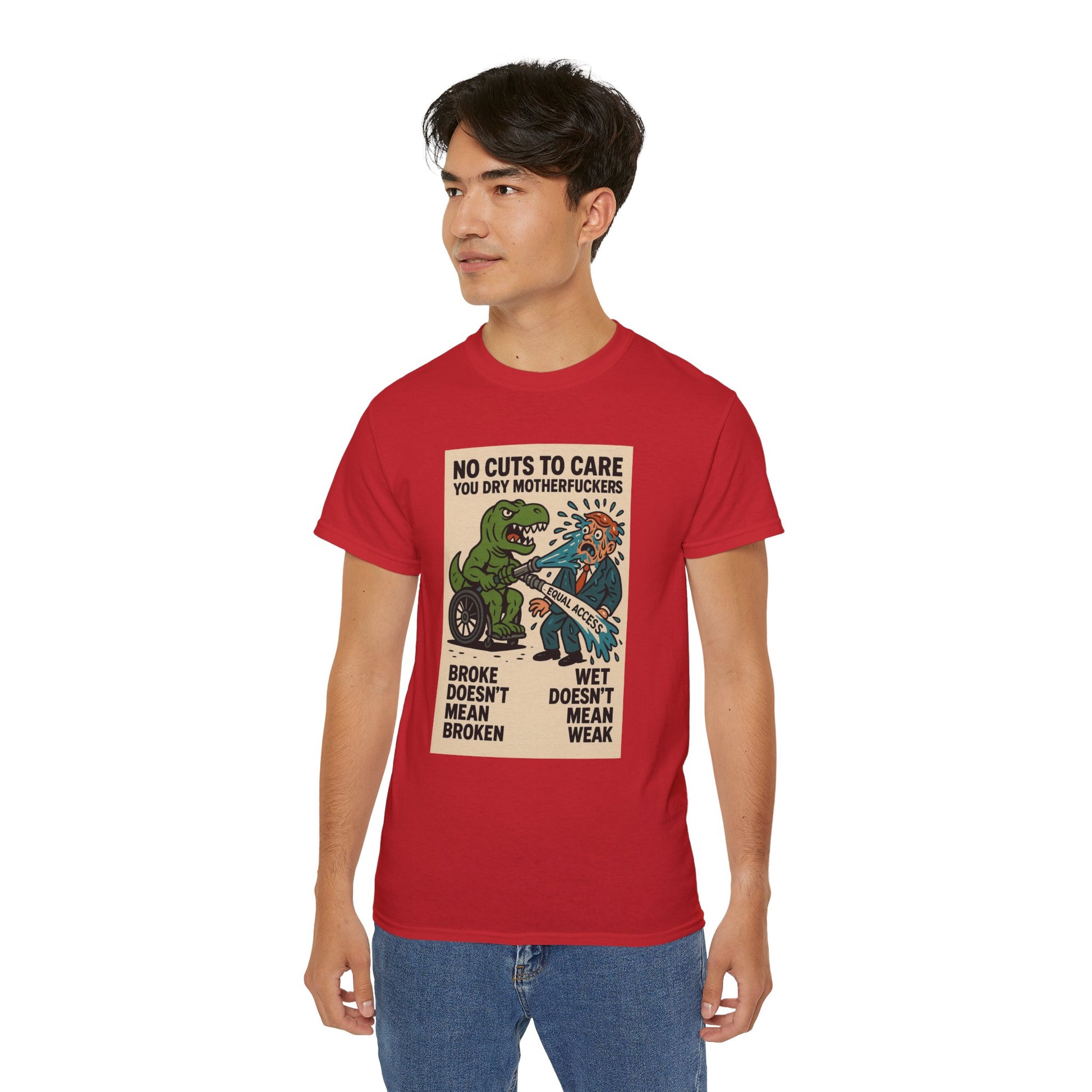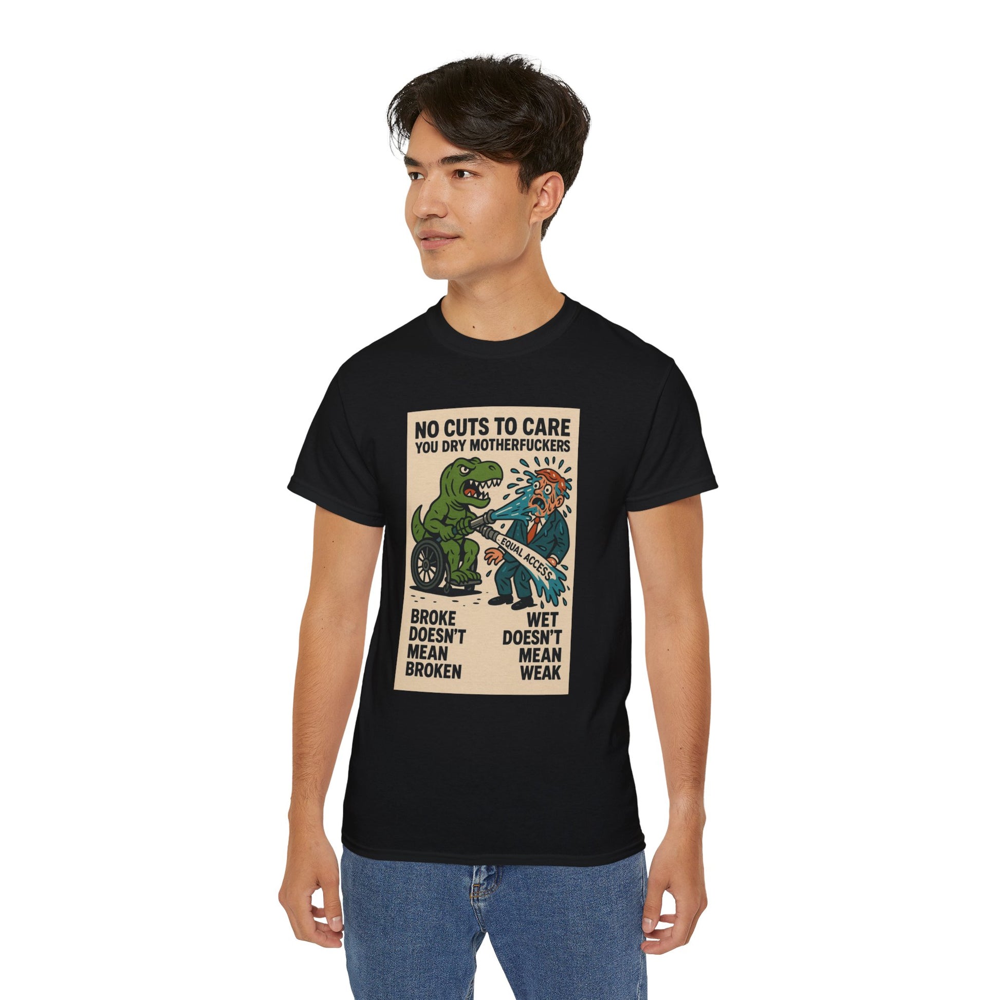 This one’s for every disabled badass who’s ever been told to “just be patient” while their care got ghosted, delayed, or denied. Our main character? A pissed-off T-Rex in a wheelchair, dual-wielding a firehose labeled “EQUAL ACCESS” and unleashing a biblical flood on some clueless, suit-wearing dry-ass politician. The message is loud, proud, and soaking wet: NO CUTS TO CARE YOU DRY MOTHERFUCKERS. Because if we can’t get healthcare, ramps, or respect — we’ll settle for unleashing prehistoric vengeance and drenching bureaucracy in justice. “Broke doesn’t mean broken” and “wet doesn’t mean weak” — this shirt spits truth harder than any motivational poster ever could.