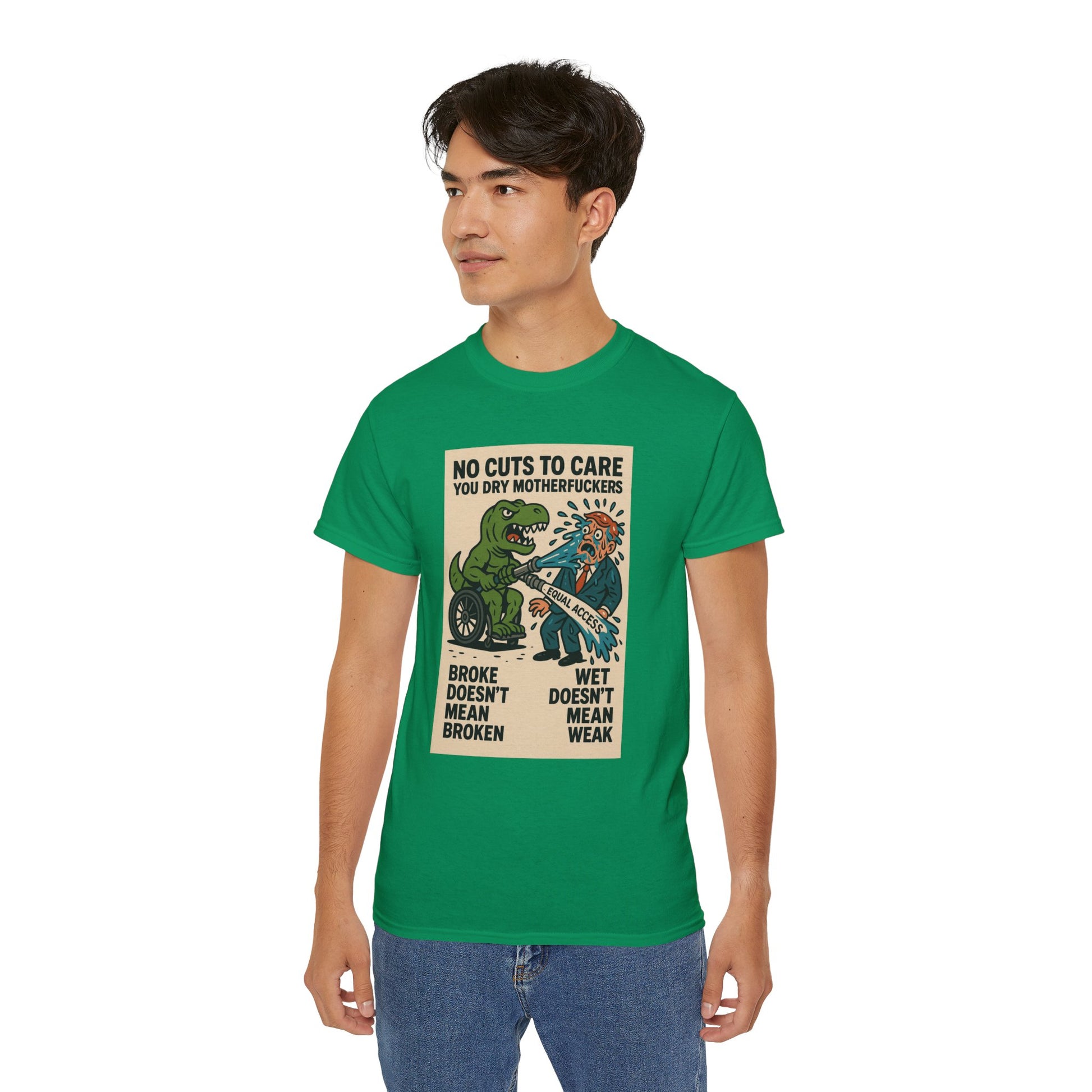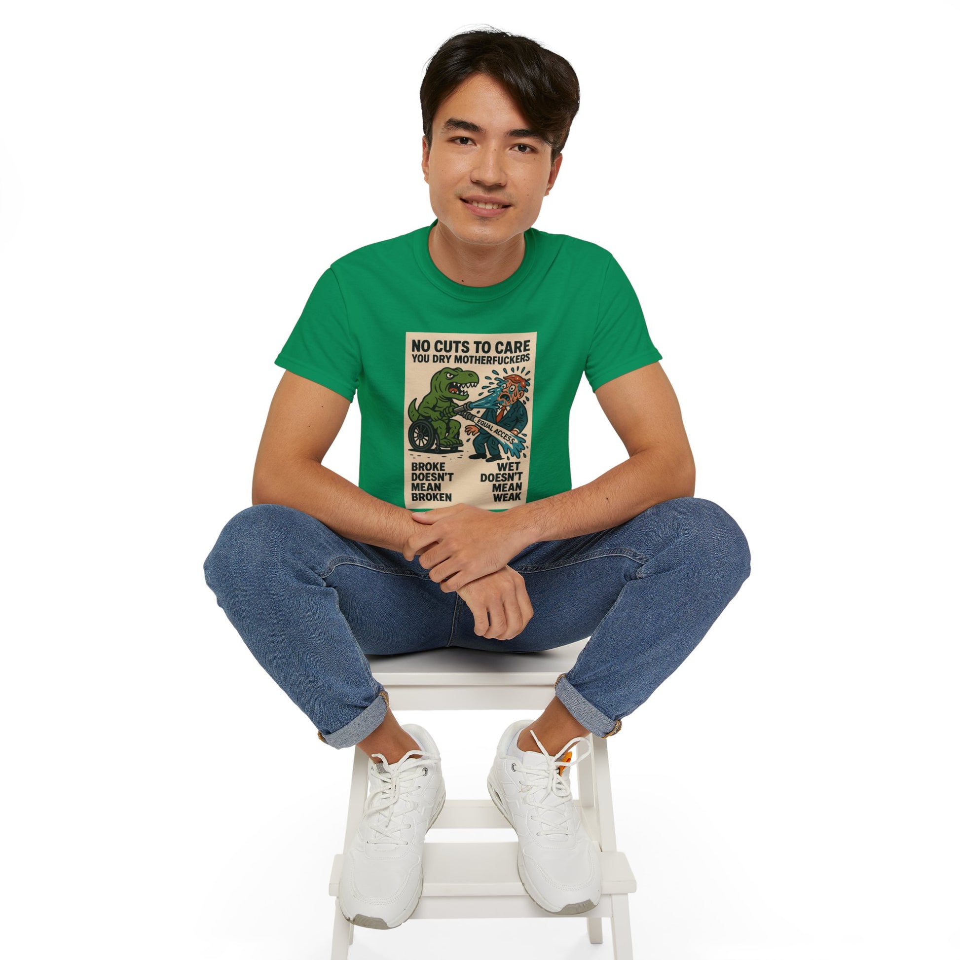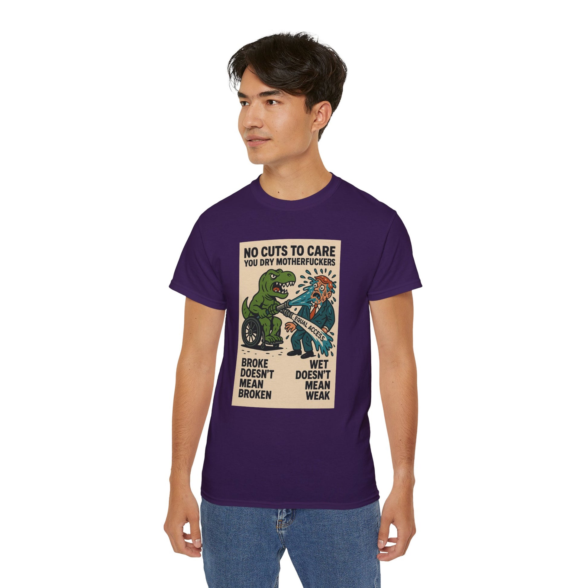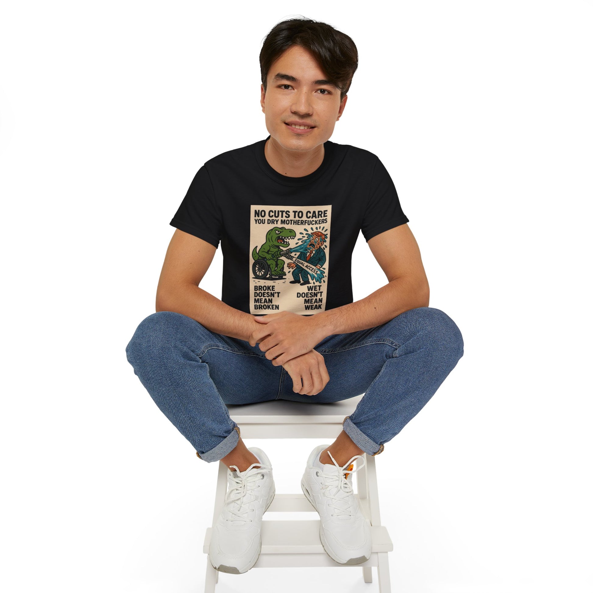 This one’s for every disabled badass who’s ever been told to “just be patient” while their care got ghosted, delayed, or denied. Our main character? A pissed-off T-Rex in a wheelchair, dual-wielding a firehose labeled “EQUAL ACCESS” and unleashing a biblical flood on some clueless, suit-wearing dry-ass politician. The message is loud, proud, and soaking wet: NO CUTS TO CARE YOU DRY MOTHERFUCKERS. Because if we can’t get healthcare, ramps, or respect — we’ll settle for unleashing prehistoric vengeance and drenching bureaucracy in justice. “Broke doesn’t mean broken” and “wet doesn’t mean weak” — this shirt spits truth harder than any motivational poster ever could.