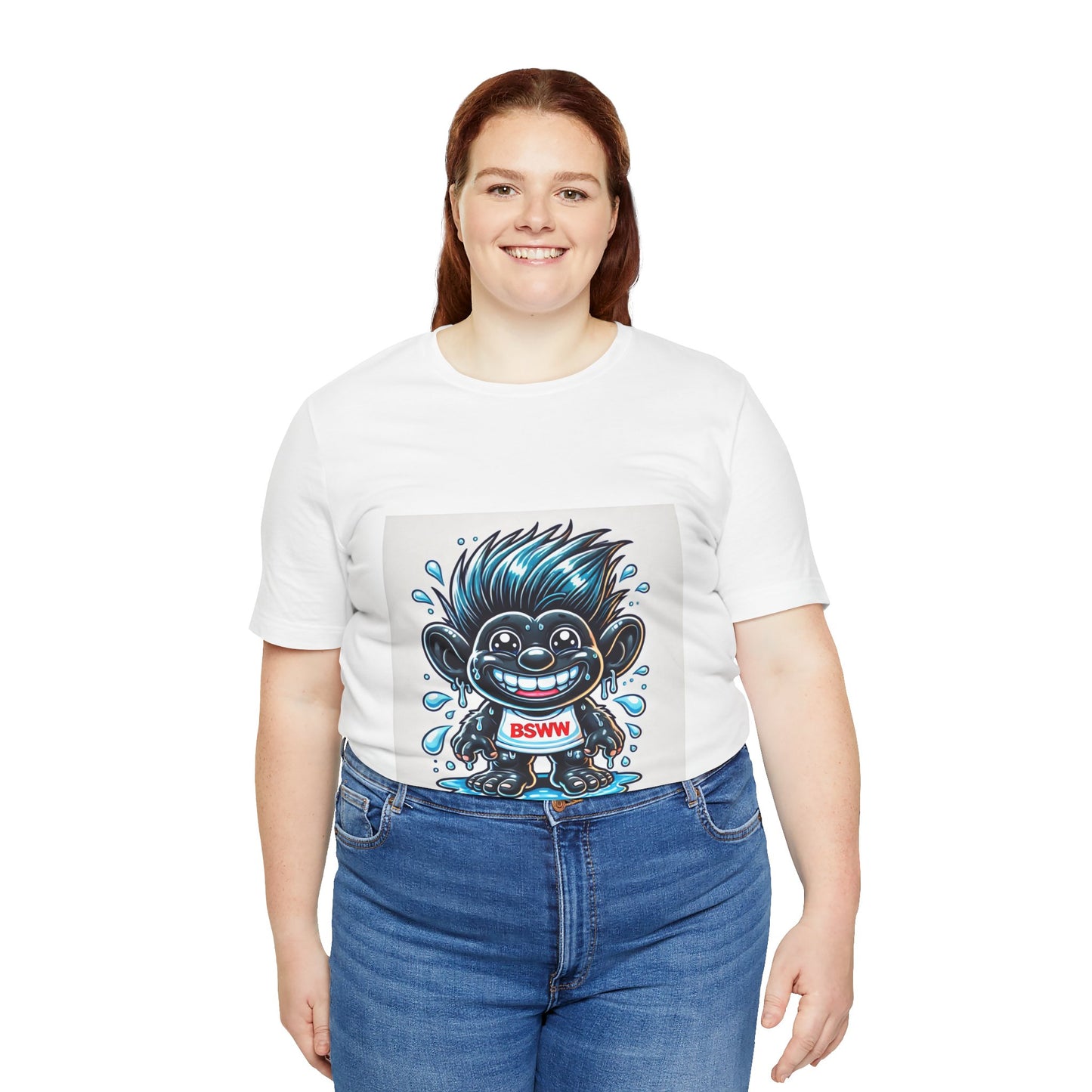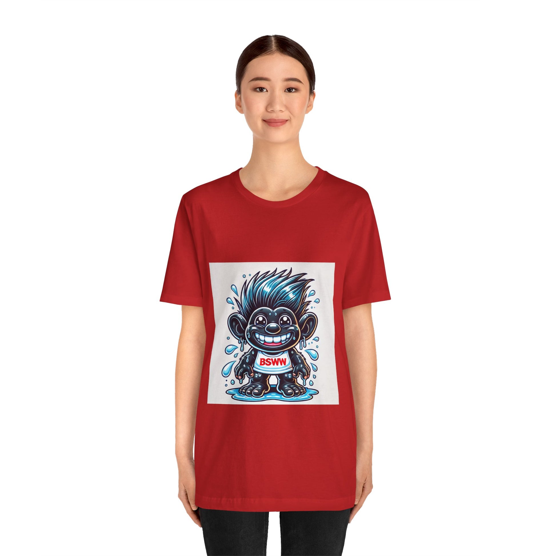 Meet Splish, BS Wetwear’s unofficial puddle enthusiast and full-time splash hazard. He’s short, soaked, and proudly rocking a tank two sizes too small—because fashion should cling when wet. His hair looks like it fought a thunderstorm and lost, but he’s never been happier. With no frog, no duck, and no shame, he’s the moistest mascot in the game. Warning: standing too close may result in spontaneous soaking and compliments.