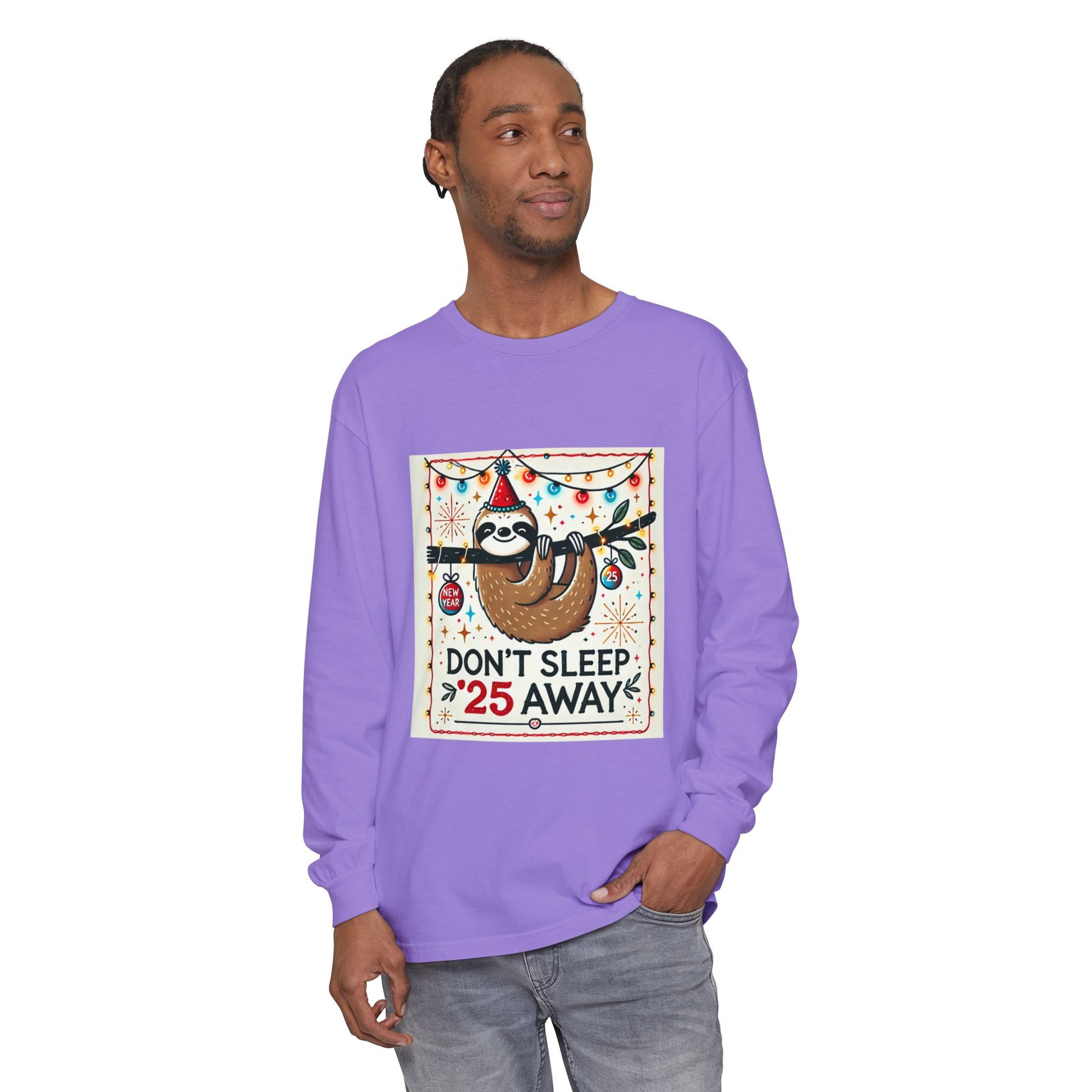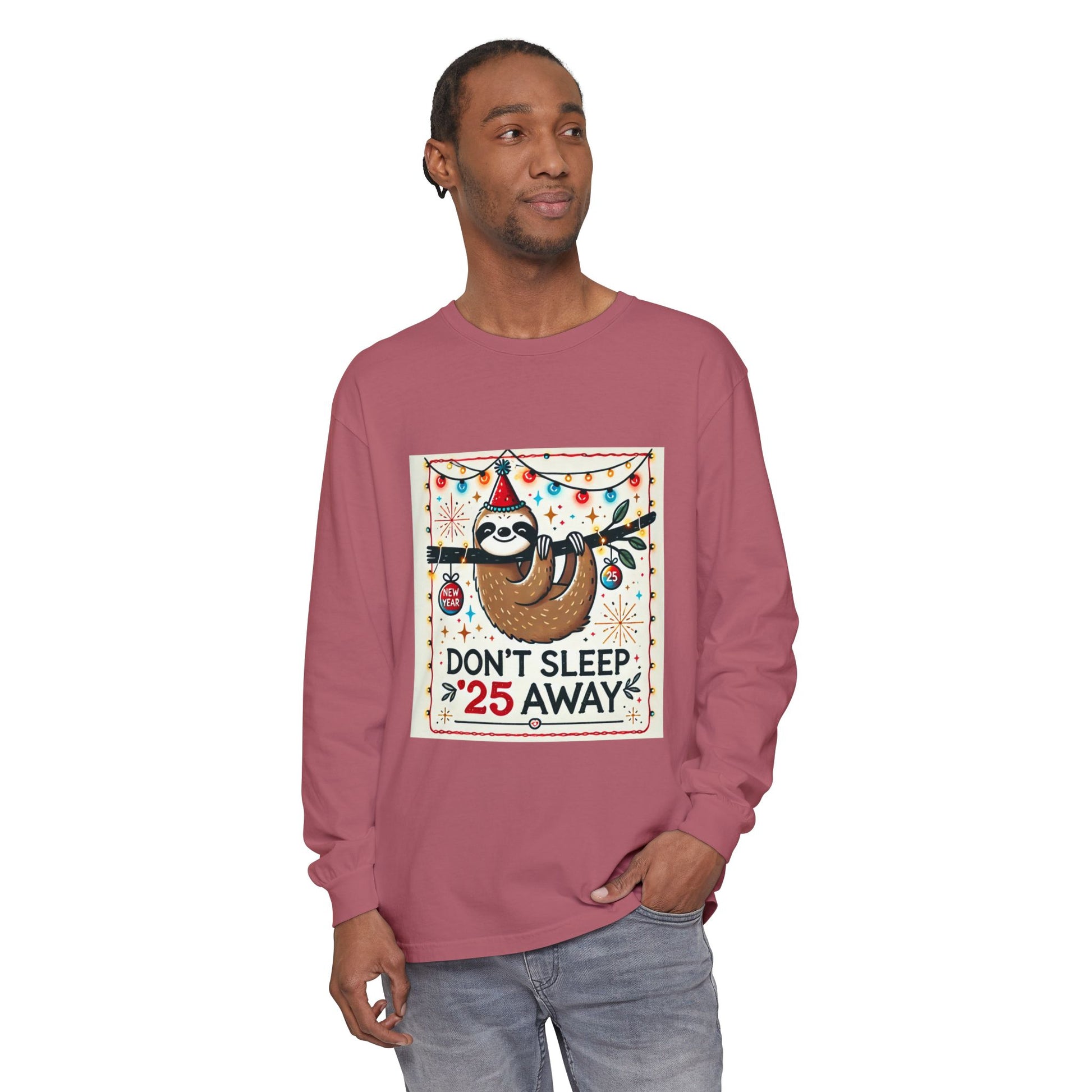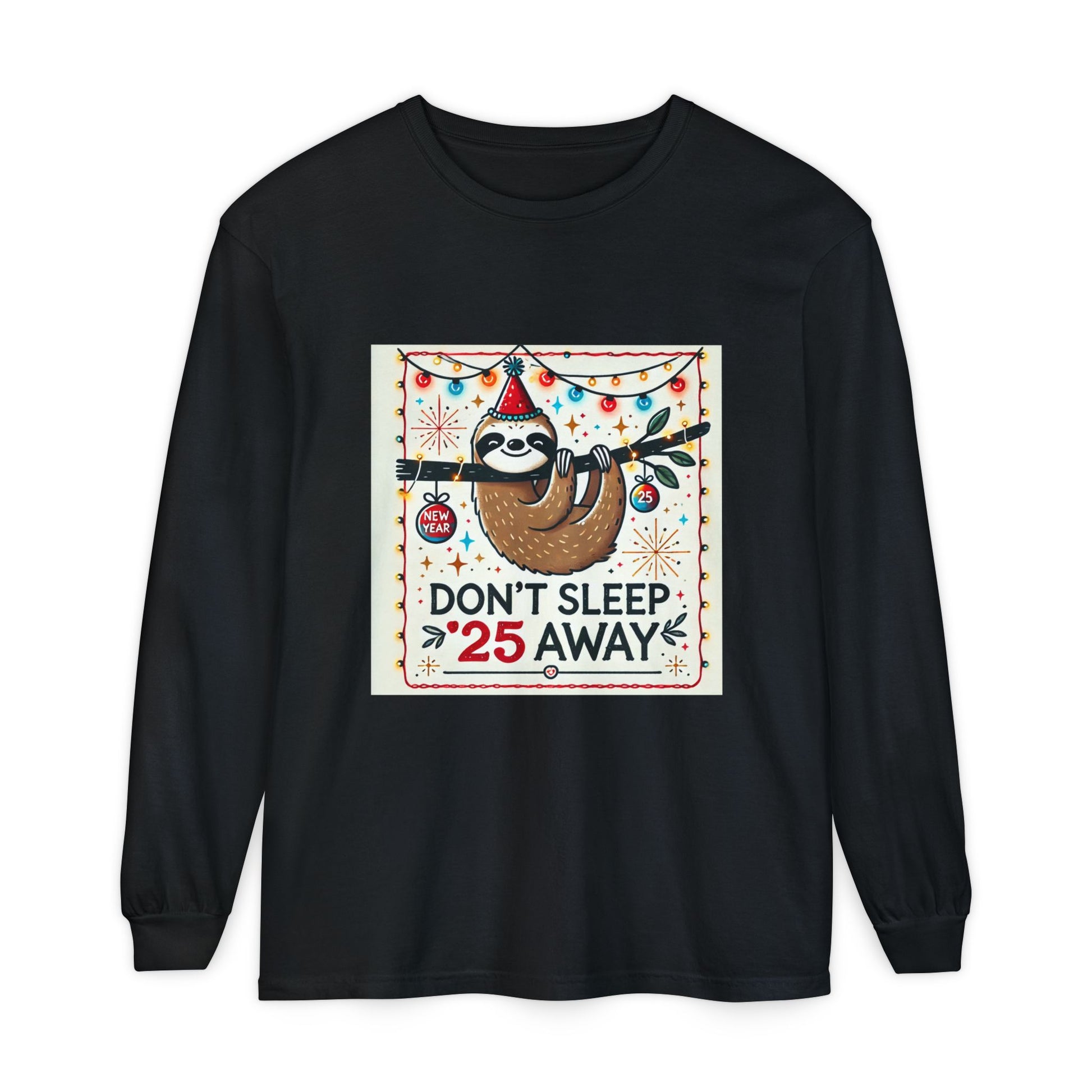 This festive design showcases a charming sloth hanging from a branch, decked out in a New Year's party hat and surrounded by colorful holiday lights. The sloth is caught in the middle of the celebration, with fireworks and confetti enhancing the background, creating a lively and joyous scene. The slogan "Don't Sleep '25 Away" is a playful reminder to make the most of the new year, emphasizing fun and activity over hibernation. This image combines whimsy and festive cheer, perfect for spreading New Year's excitement with a humorous twist.