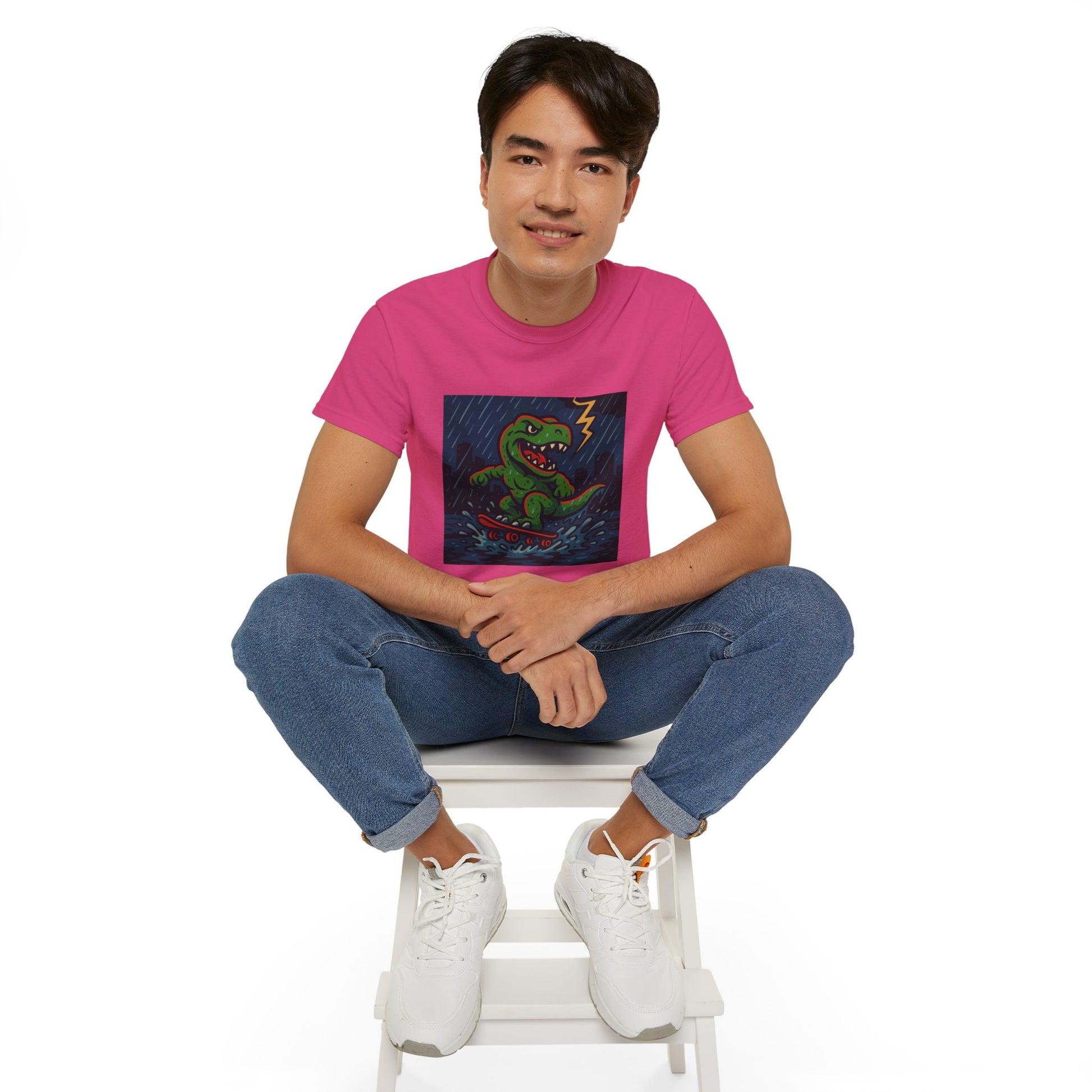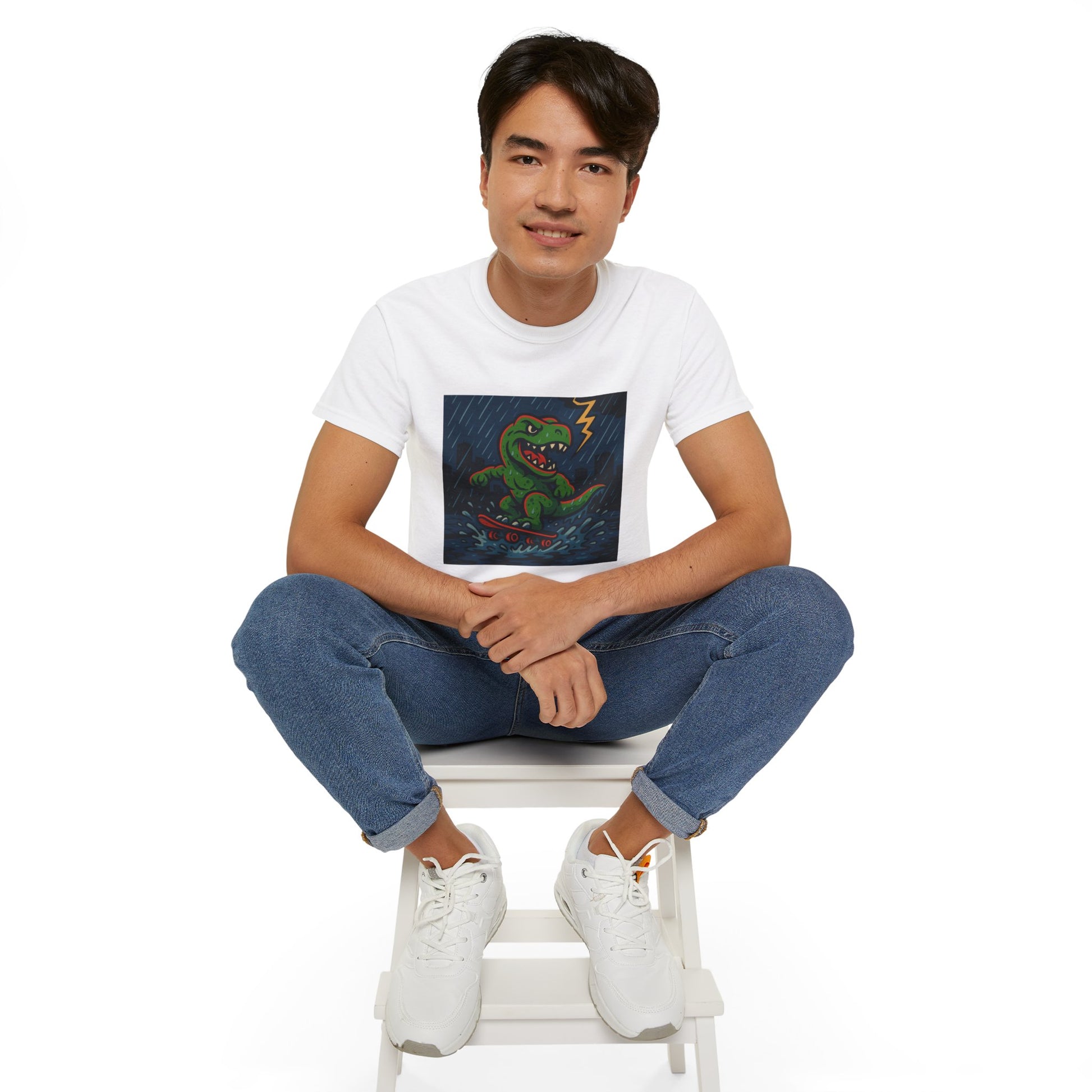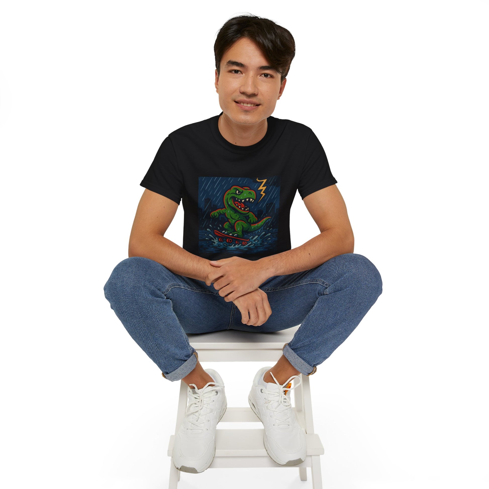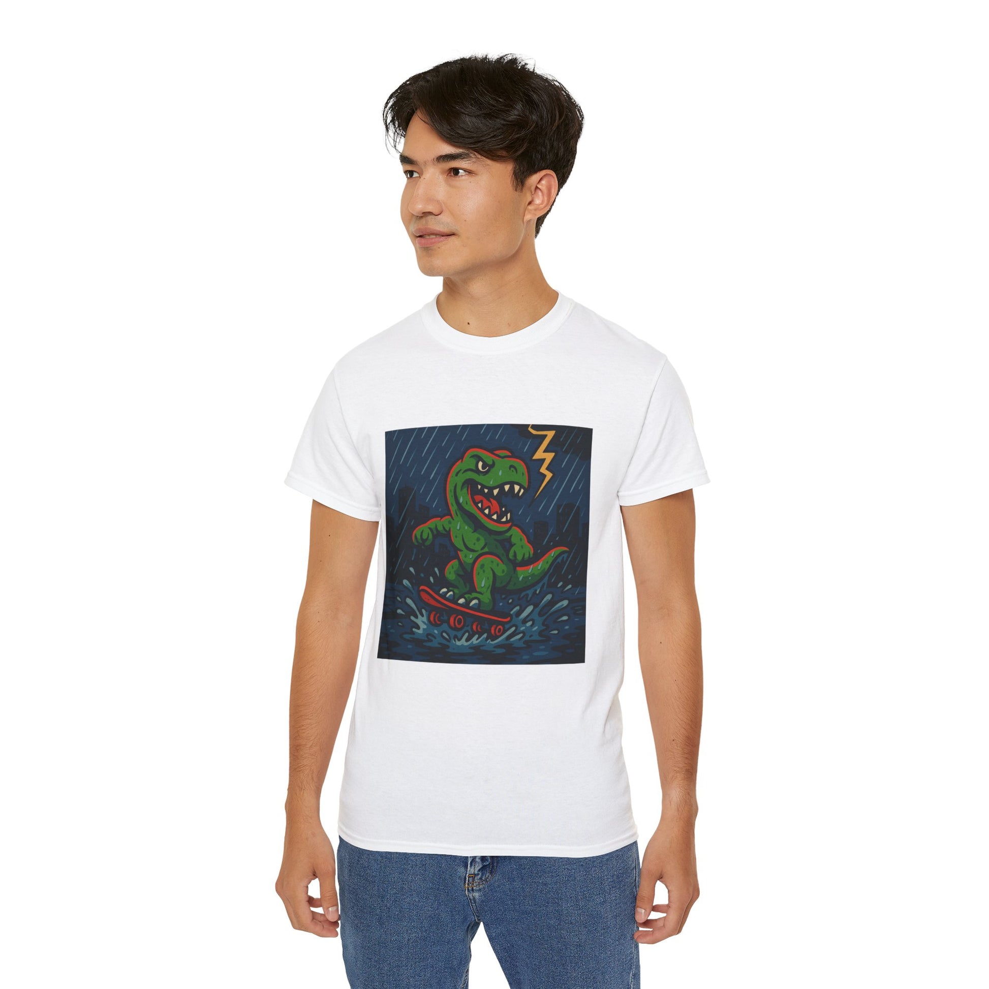 Meet the prehistoric punk who skates through thunderstorms like it's just another Tuesday—introducing T-Rain Rex! This bad boy’s got tiny arms, big attitude, and a skateboard that hydroplanes harder than your cousin’s Honda Civic. He’s not here to roar, he’s here to shred—and maybe destroy a few city blocks while he’s at it. Soaked to the bone but still flexin’, Rex makes rain look like a fashion statement. Warning: wearing this tee may cause sudden urges to ollie over extinction-level puddles.