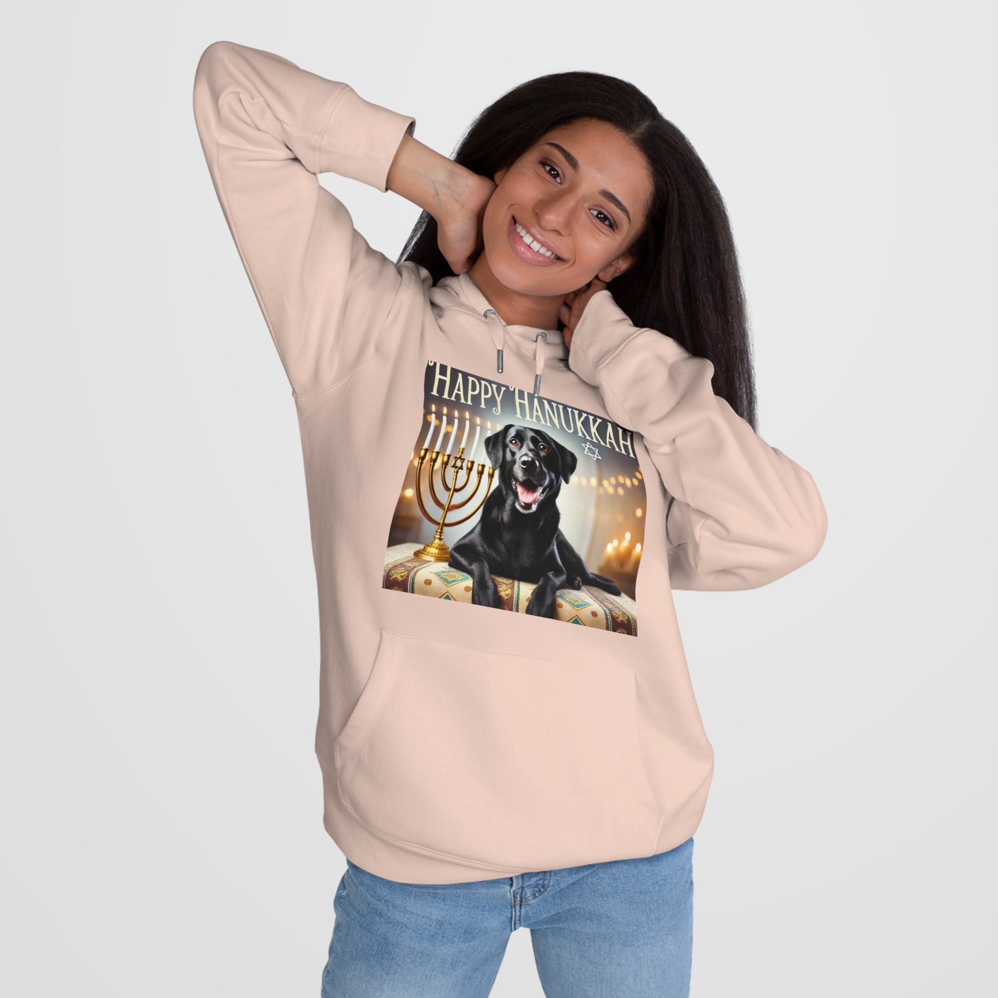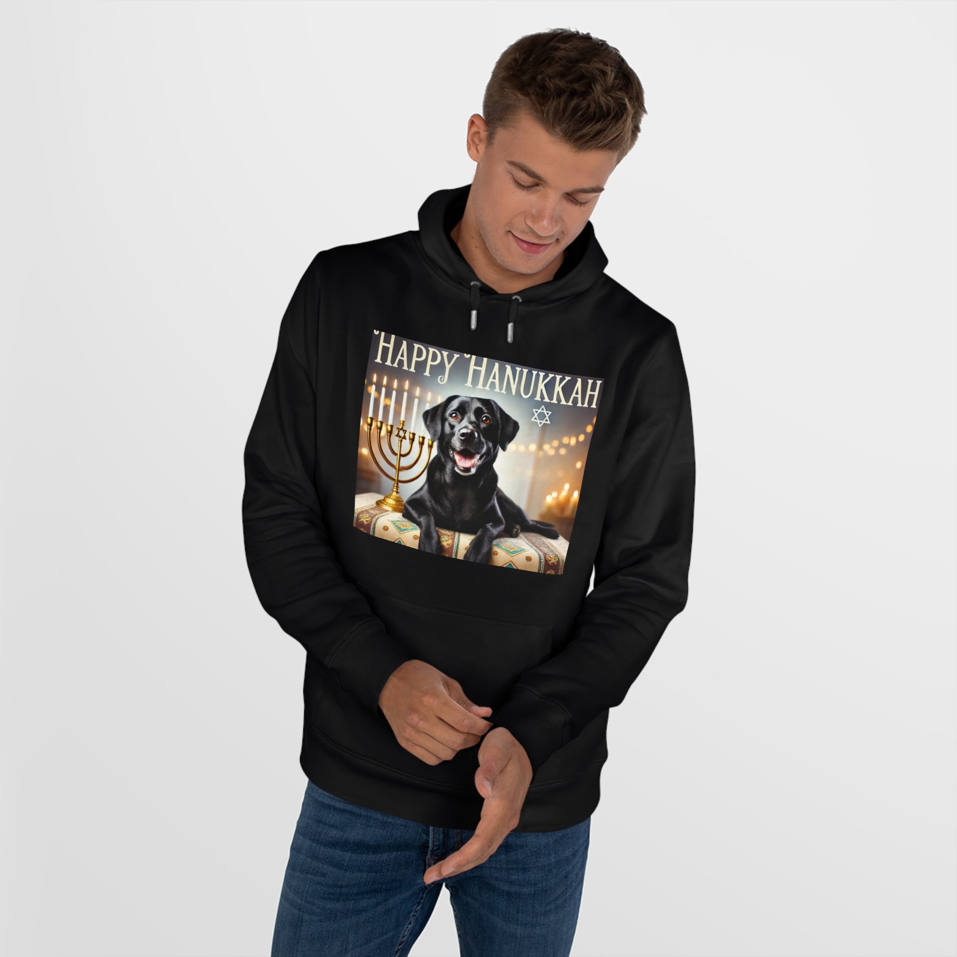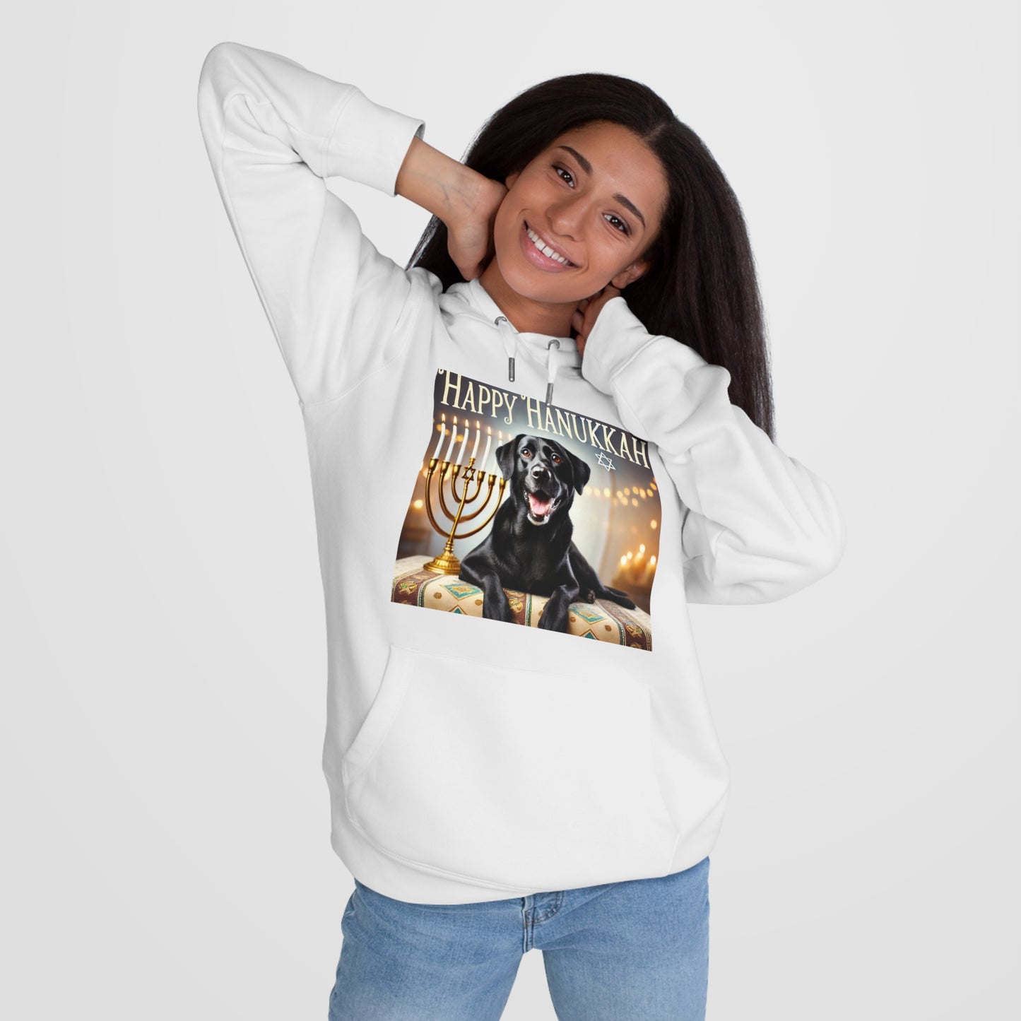 Celebrate the Festival of Lights wit a touch of heartwarming cheer! Our beloved mascot, Tonka, is here to spread joy with his broad smile and wagging tail, captured beautifully in this festive scene. As he lies comfortably in front of a brilliantly lit menorah, the glowing candles illuminate his shiny black coat, enhancing the warmth of the holiday. Above him, the words "Happy Hanukkah" are elegantly scripted, inviting all to share in the celebration. Perfect for setting a joyful tone this season!