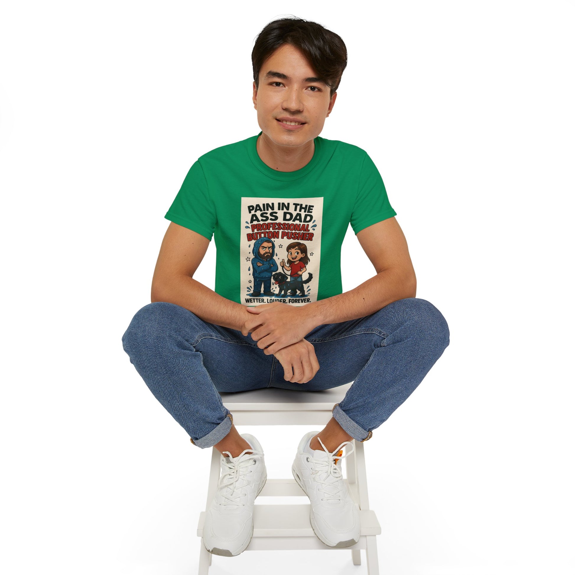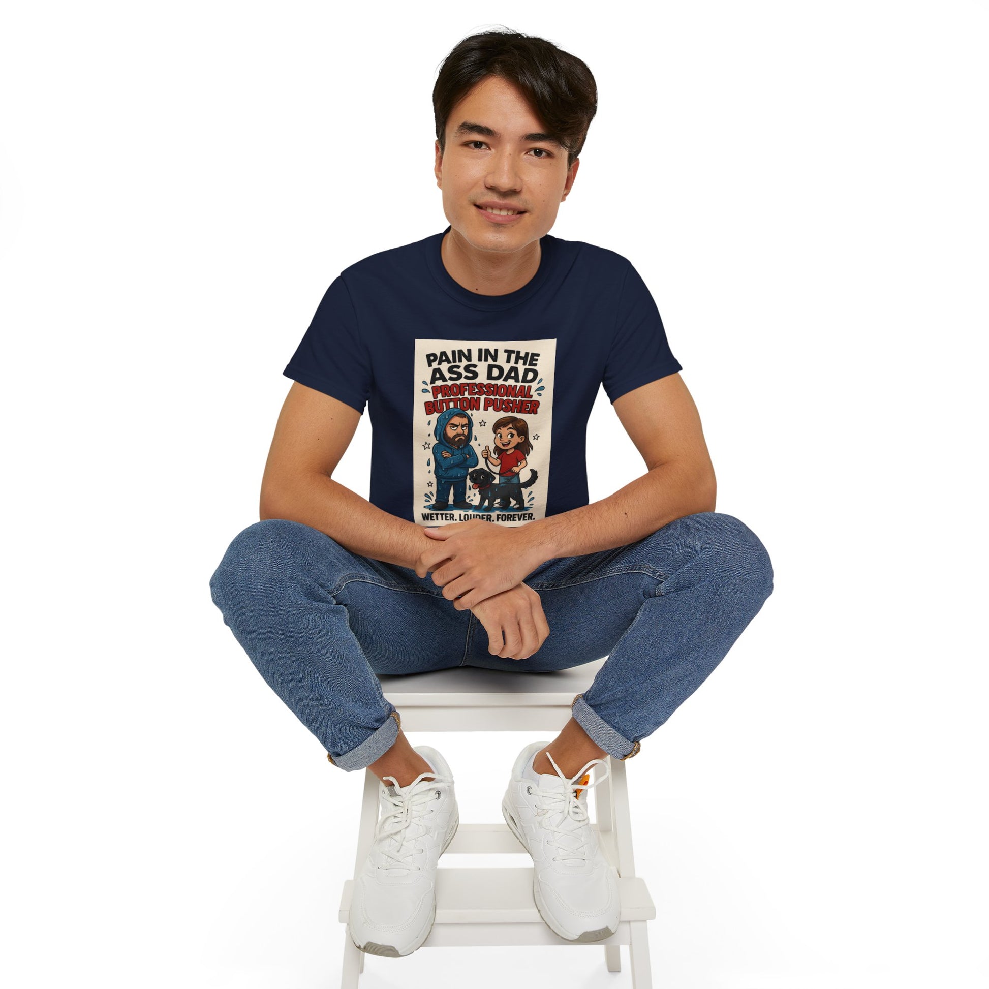 This tee is a full-blown tribute to that beautiful battlefield known as fatherhood — where sarcasm is fluent, patience is fictional, and someone definitely tracked water into the house.