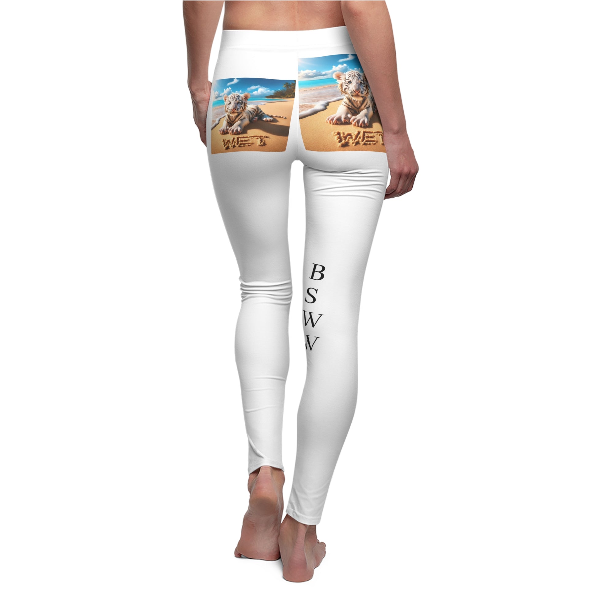 BS Wetwear: where your bottom roars louder than your wardrobe. Slip into our leggings featuring a charmingly soggy baby white tiger on the butt that ensures your exit is as memorable as your entrance. With the bold "BSWW" logo up front, proclaim to the world that you're both stylish and a little bit wild—unafraid to make a splash in the fashion jungle.